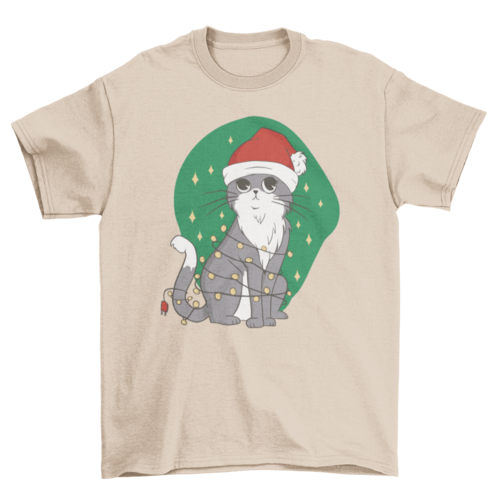 Funny t-shirt design featuring a cat in christmas tree lights with santa hat in illustration style
