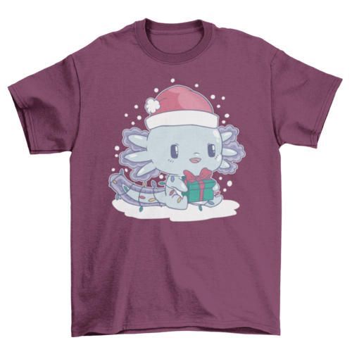 Adorable t-shirt design featuring an axolotl with christmas lights and a present.