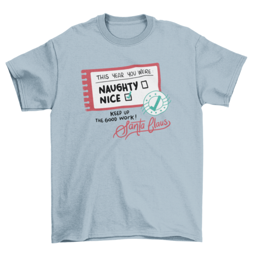 Cute t-shirt design featuring Santa's nice and naughty children list with the words "This year you were nice, keep up the good work".