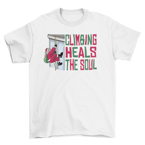 Check this cool Christmas t-shirt design featuring Santa climbing a building and the quote 'Climbing heals the soul'.