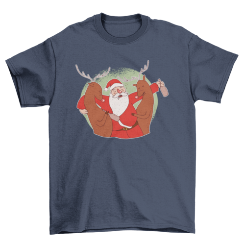 Drunk Santa t-shirt design featuring Santa having a jolly drink with two of his reindeer.