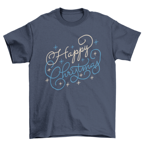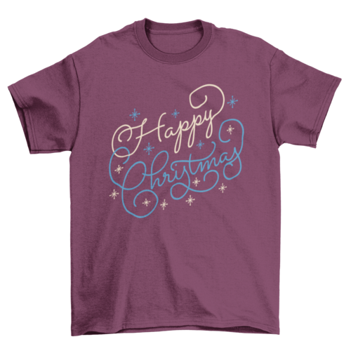 Holiday t-shirt design featuring an artistic lettering reading "Happy Christmas" in two colors with stars around. C