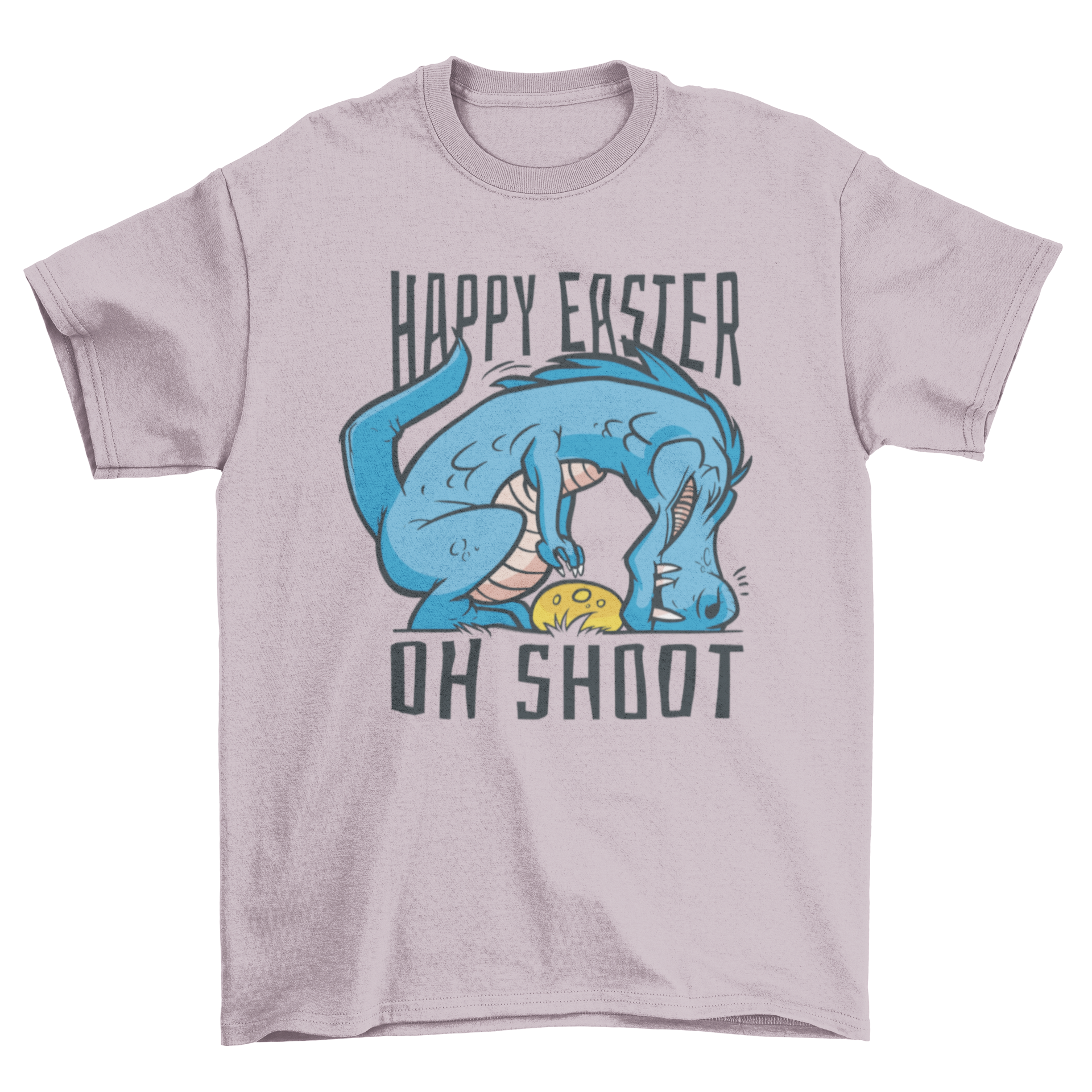 Funny t-shirt design featuring a dinosaur with an easter egg and the quote "Happy easter, oh shoot".