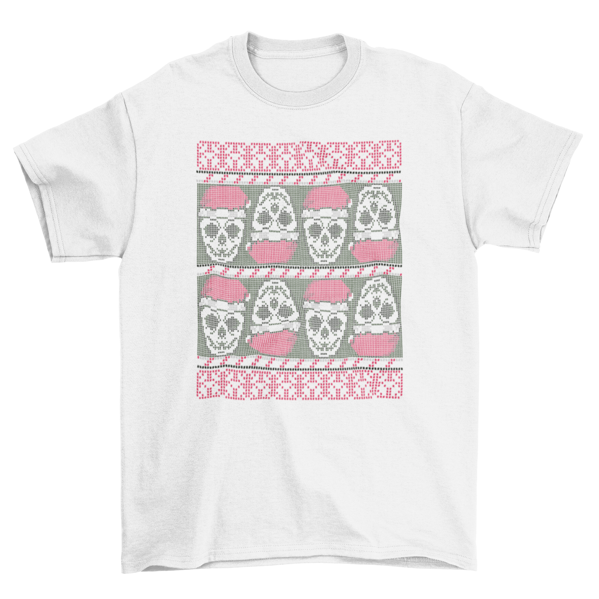 Cool Christmas t-shirt featuring an ugly sweater design with skulls wearing Santa hats