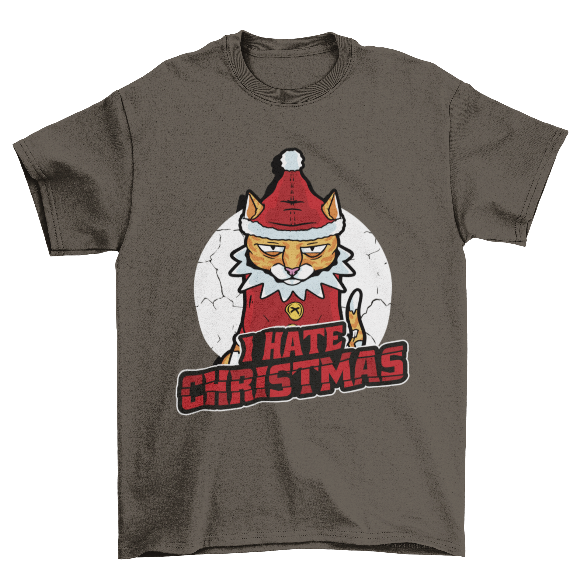 Great anti-Christmas t-shirt design featuring a grumpy cat and the quote 'I hate Christmas'.