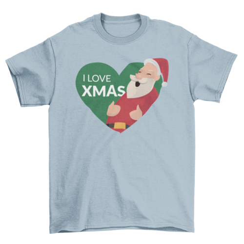 I Love Xmas Santa Christmas T-shirt Design showing Santa Smiling inside a green heart and the words I LOVE XMAS.