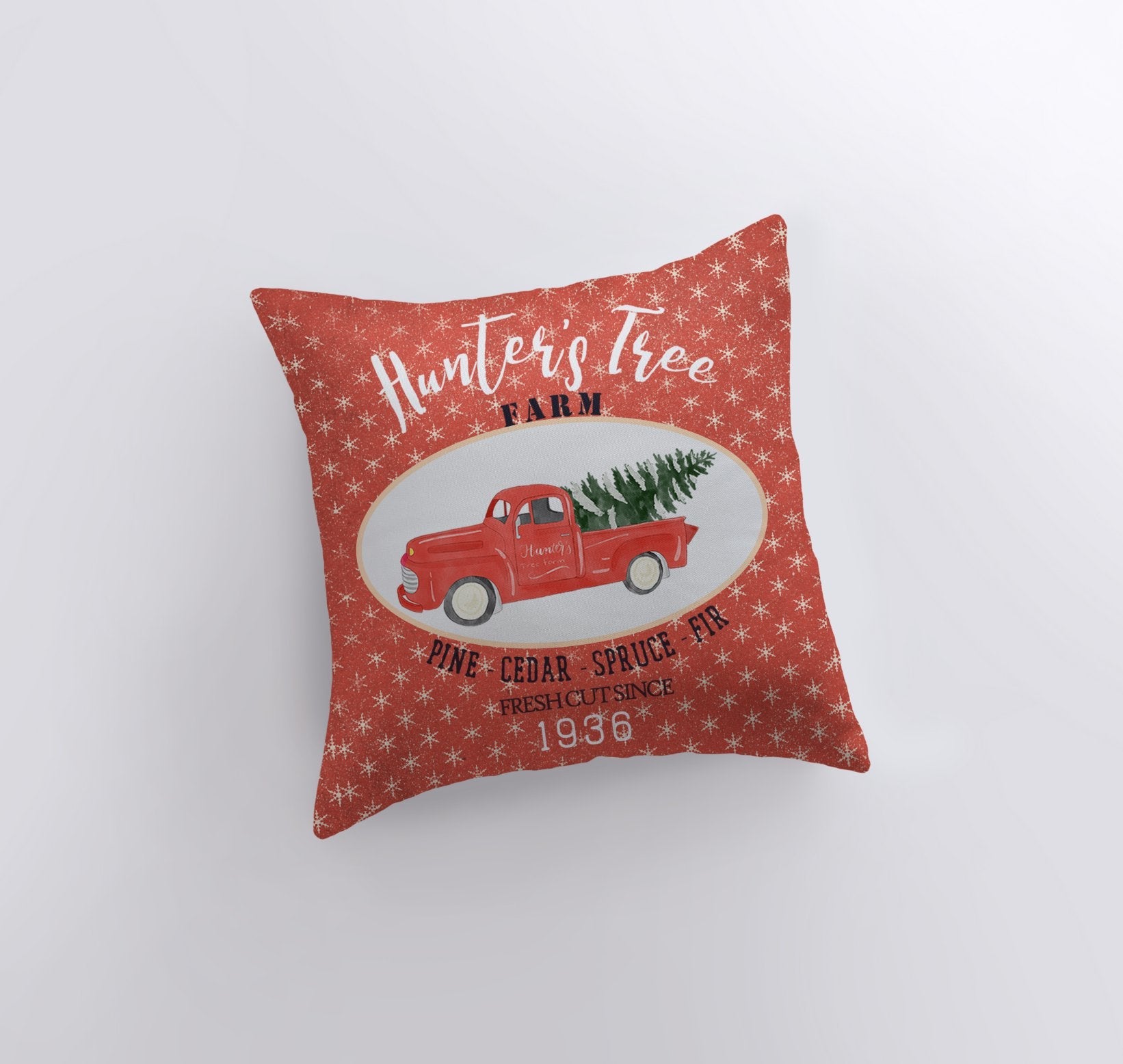 What's your choice? Pine, cedar, spruce, or fir? This adorable Hunter's Tree Farm design in red and white and showcasing a vintage red truck is just to melt over! Add it to your living area for that classy, cutesy-Clause look this holiday season--it's the best complement to your own, fresh-cut and family-picked Christmas tree!