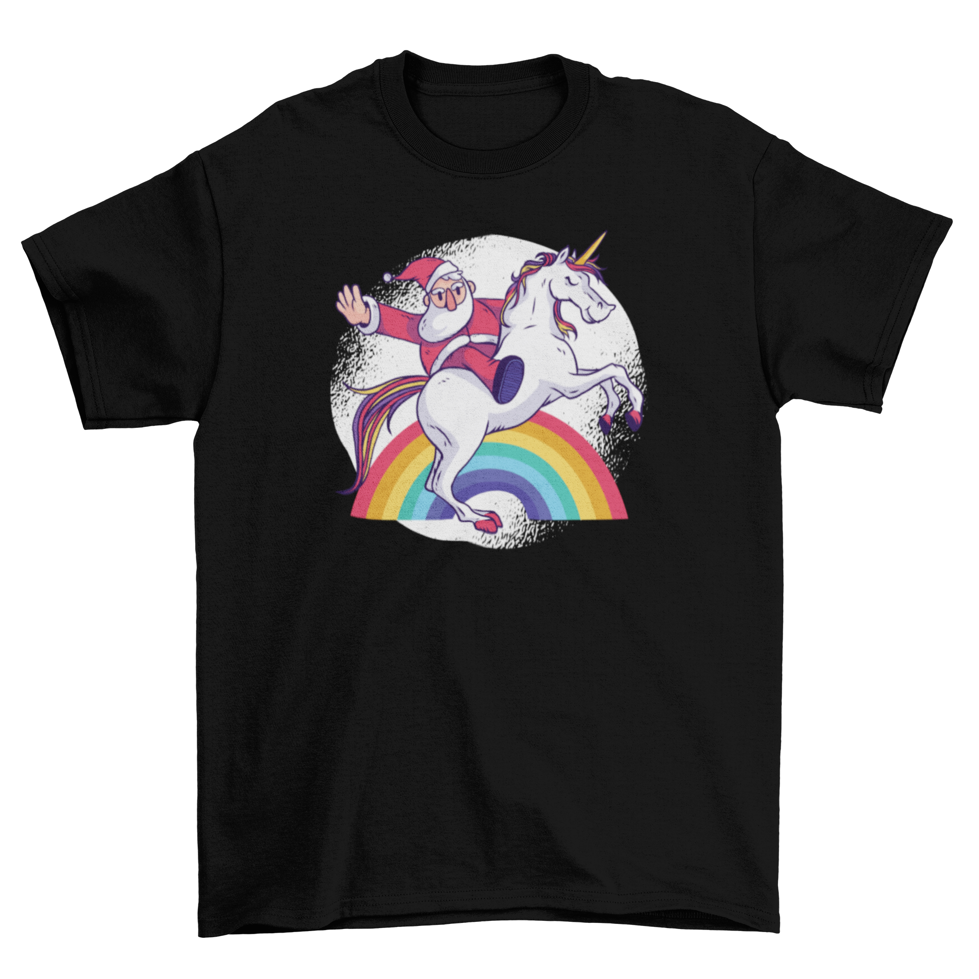 Colorful t-shirt design featuring Santa riding a unicorn over a rainbow and white grunge background.
