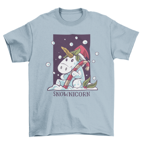 Cute Christmas t-shirt design featuring a unicorn with a santa hat hugging a candy cane and "Snownicorn" caption.