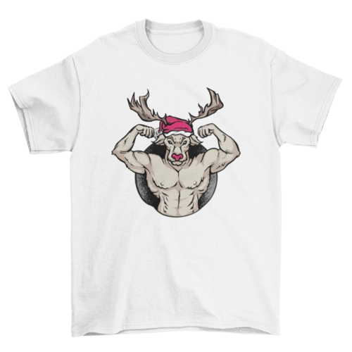 Cool t-shirt design featuring a reindeer with muscles in a christmas hat.