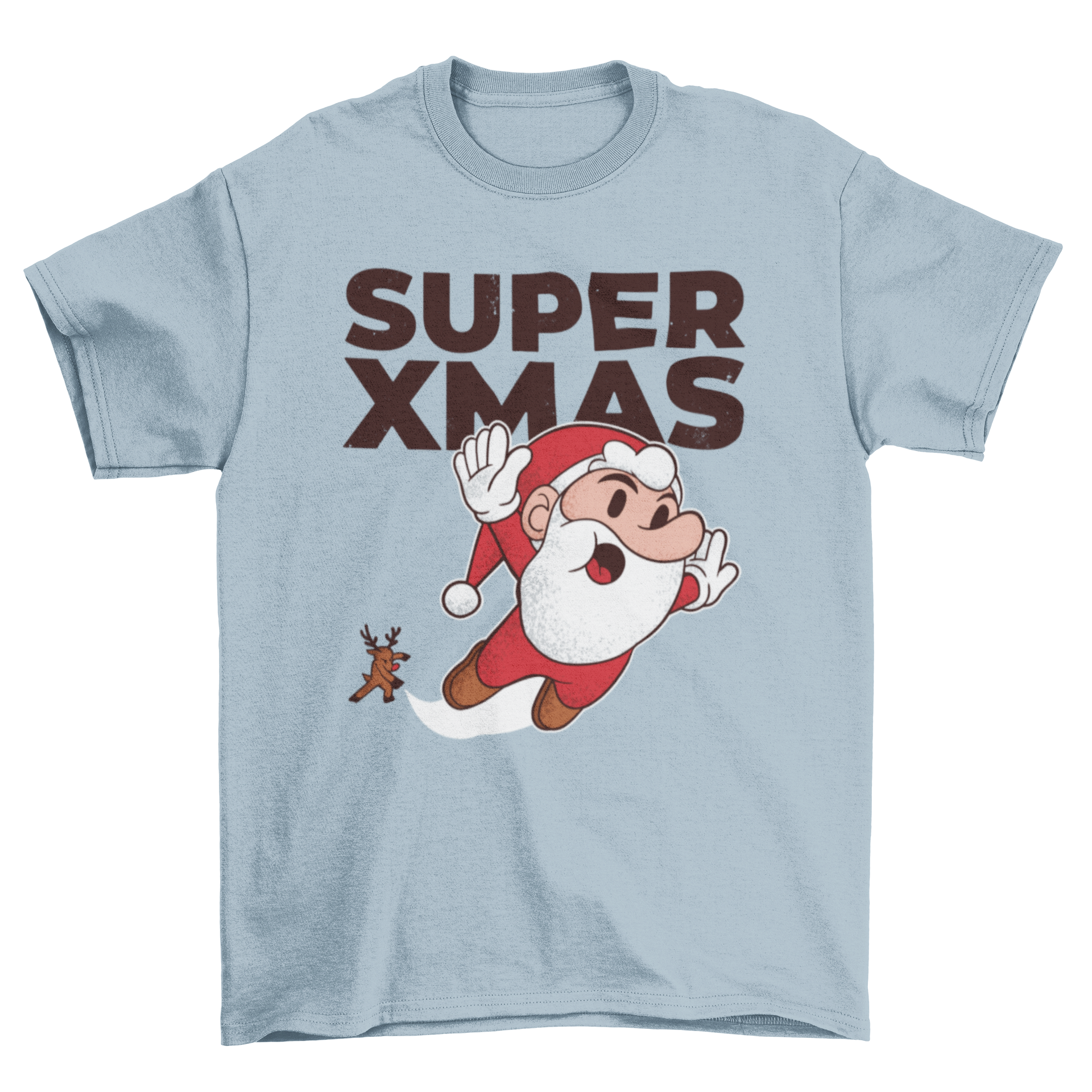 Funny Christmas t-shirt design featuring an illustration of Rudolph and Super Santa flying with "Super Xmas" caption