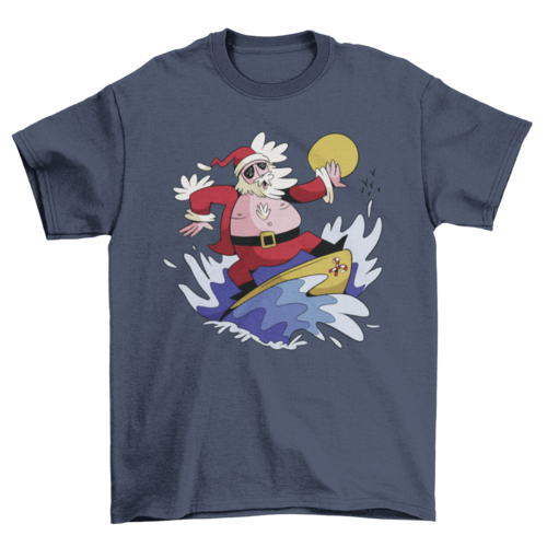 Cool t-shirt design that features santa claus on a surfboard.